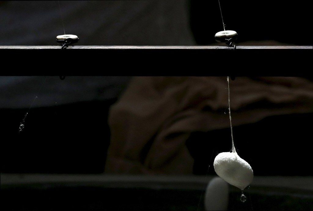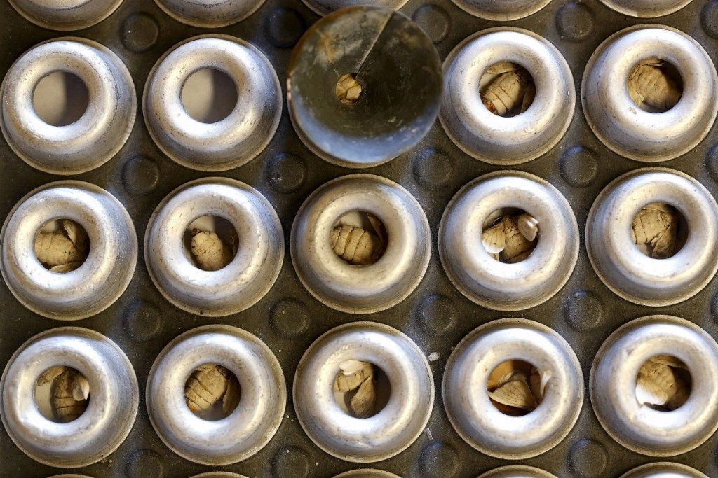 بحركة ثابتة وسريعة، تعمل الدودة على حياكة الشرنقة بدءاً من الرأس على شكل رقم 8.