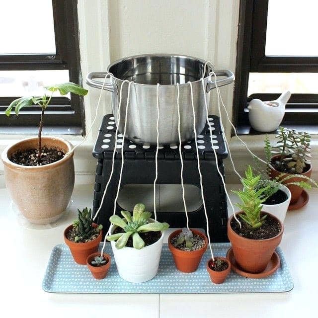 وهناك طريقة أخرى مشابهة لكنها تخدم كل نبات على حدة وفيها يتم وضع إناء بارتفاع وعاء النبتة نفسه ويملأ بالماء ويوضع جوار وعاء النبتة ثم يوضع خيط قماشي مثل خيط من الخيش (القنب) يتدلى أحد طرفيه إلى أسفل الإناء والطرف الآخر يلف حول ساق النبتة فوق التراب.