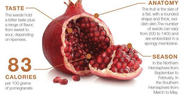 تحتوي كل حبة فاكهة من الرمان على 230 وحدة سعر حراري، 20٪ من البوتاسيوم الذي يحتاجه جسمك في اليوم الواحد و50٪ من متطلبات فيتامين “سي”.