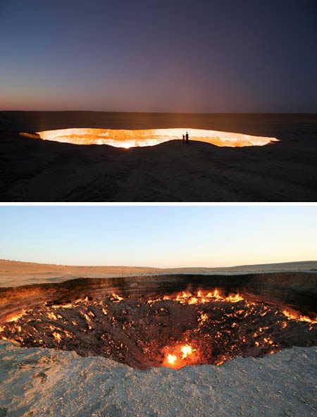 في قلب صحراء كاراكوم في تركمانستان، يعطي باب جهنم توهجاً يمكن رؤيته من على بعد أميال خلال ليلة مظلمة، يمكن اكتشاف رائحة حرق الكبريت عن بعد وتصبح قوية جداً كما كنت بالقرب من الحافة الساخنة من الفوهة. جاء باب جهنم نتيجة التنقيب السوفيتي عن الغاز الطبيعي في عام 1950 ويبلغ طول الحفرة حوالي 60 متراً وقطر 20 متراً.