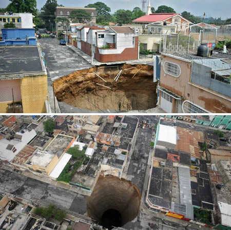 هذا المشهد حدث بعد ثقب بالوعة صرف صحي بعمق 200 قدم حيث ابتلعت مبنى مكون من ثلاثة طوابق. عصفت الأمطار الغزيرة والانهيارات الطينية والرياح العاتية خلال العاصفة الاستوائية أجاثا بمدينة جوالاتيمالا، حيث غرقت المدينة بأكثر من 3 أقدام من المطر الغزير. أجاثا هي أول عاصفة مسماة في موسم المحيط الهادي عام 2010.