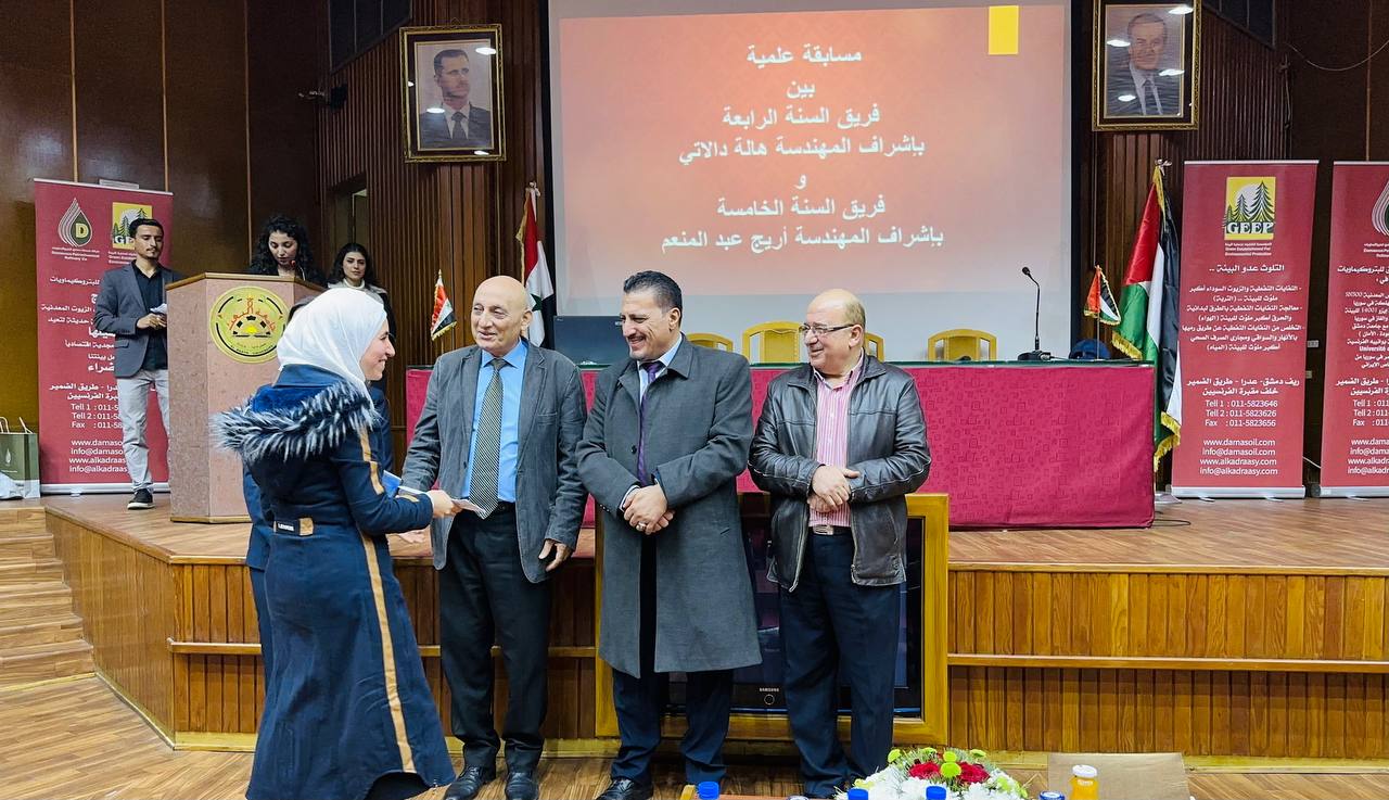 وخلال الفعالية وبمناسبة مرور /23/ عاماً على تأسيس شركة مصفاة دمشق للبتروكيمياويات وتنفيذاً لمذكرات التفاهم الموقعة مع الجامعات السورية وبهدف تشجيع الطلبة على البحث العلمي، أعلنت الشركة عن “المسابقة العلمية الثانية” لكل الطلبة باختصاص كيمياء وهندسة بترولية من خلال تقديم بحث علمي حول “إزالة اللون والرائحة من المشتقات النفطية وزيوت الأساس المعدنية الكيروسين المستخدم في صناعة الأيزو سولات وصناعة النسيج وصناعة الوايت سبرت والوايت أويل وكل أنواع المشتقات النفطية”.